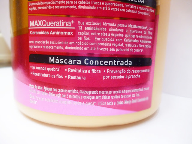 Na sua fórmula contém Maxqueratina, com 13 aminoácidos similares a queratina da fibra capilar, entre eles a Arginina que age reconstruindo os Fios, legal não é? O produto diz ser enriquecido com Gloss-Intense, que realça a cor natural dos fios e reduz a opacidade, deixando o cabelo com o tal do efeito "2x mais brilho"